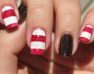I used China Glaze Japanese Koi for my orange which I sponged on along with the OPI Kennebunk-Port (The red). They were easy to work with for a quick and dirty polish job.